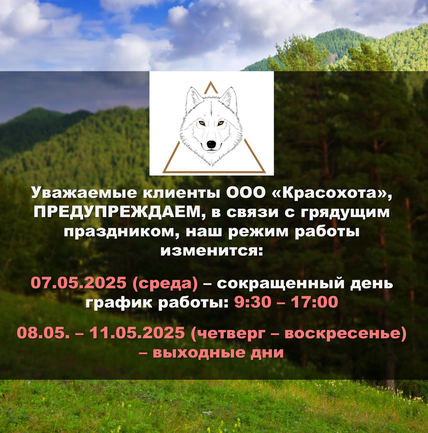 Уважаемые охотники, просим Вас обратить внимание, что работа ООО "Красохота" изменится, в связи с грядущими праздниками. Настоятельно рекомендуем Вам ознакомиться с новым расписанием, да бы избежать неловкостей и конфузов.